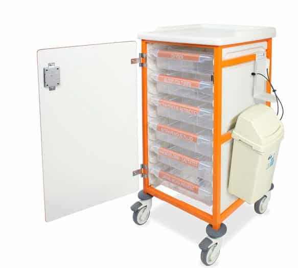 - The trolley storing medicines should be secured to the wall when not in use. See option MT/1/6F Security Clamp Sepsis Trolleys.